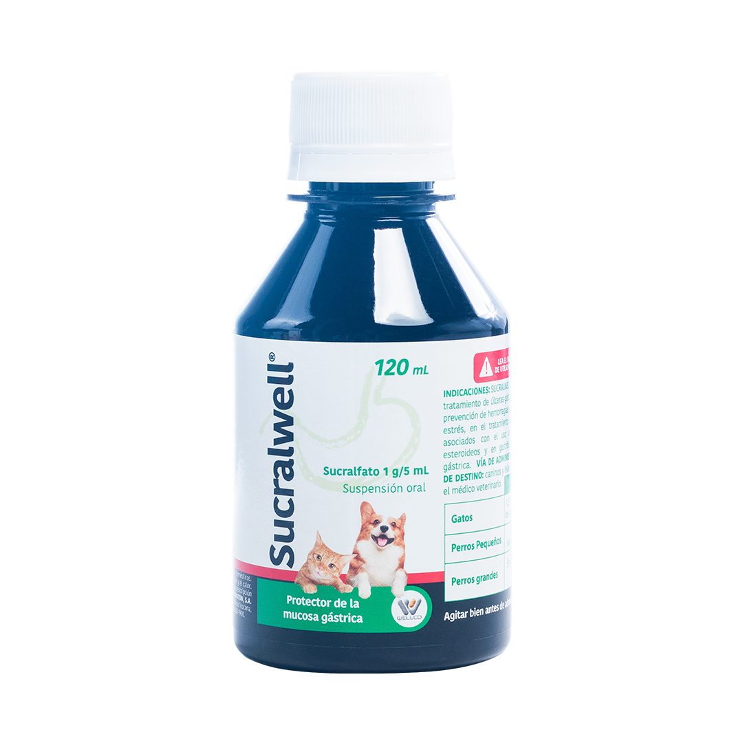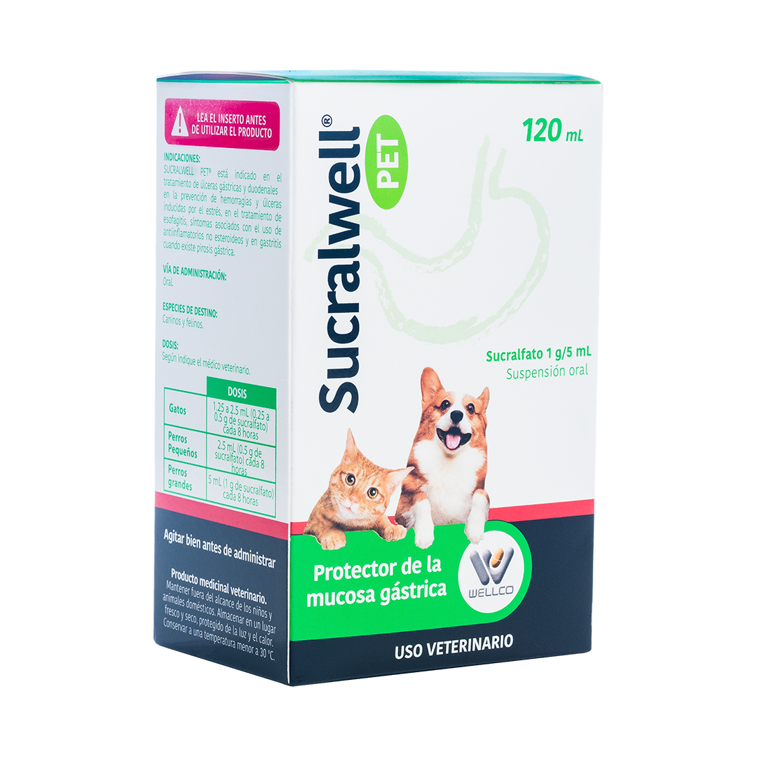 Protector gástrico para perros y gatos que ayuda a tratar úlceras y gastritis, formando una barrera protectora en el estómago e intestinos.